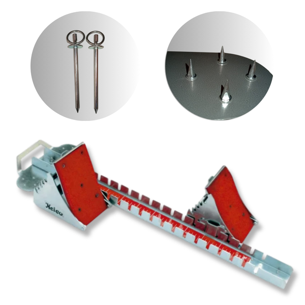 Acompanha 12 pregos para fixação em pistas sintéticas e 2 pregos para pistas de terra e carvão, garantindo firmeza em diferentes tipos de superfície.
