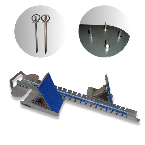 Acompanha 12 pregos para fixação em pistas sintéticas e 2 pregos para pistas de terra e carvão, garantindo firmeza em diferentes tipos de superfície.